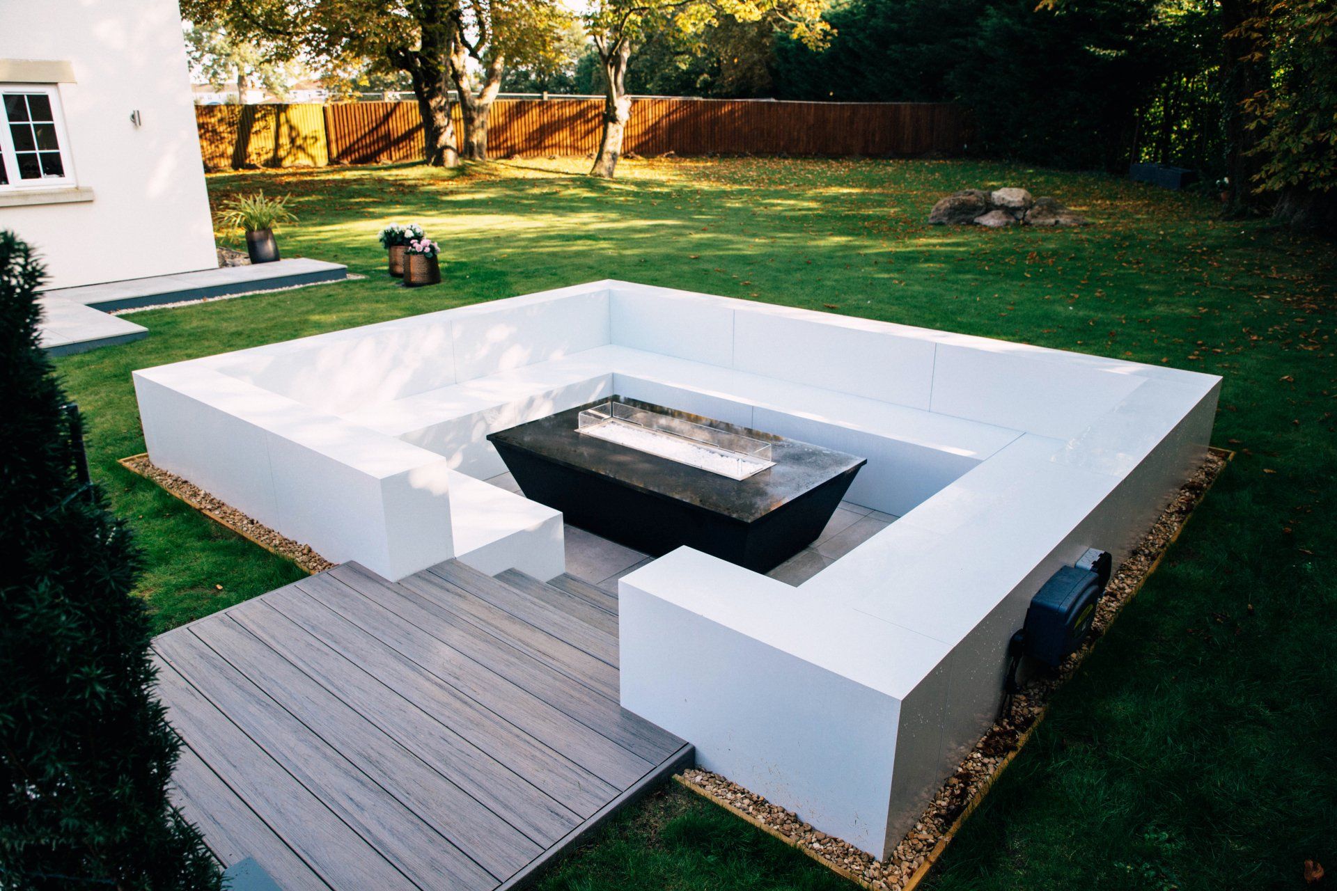 Porcelain Paving, Composite Decking, Planters, Fire Pit and Water Features.