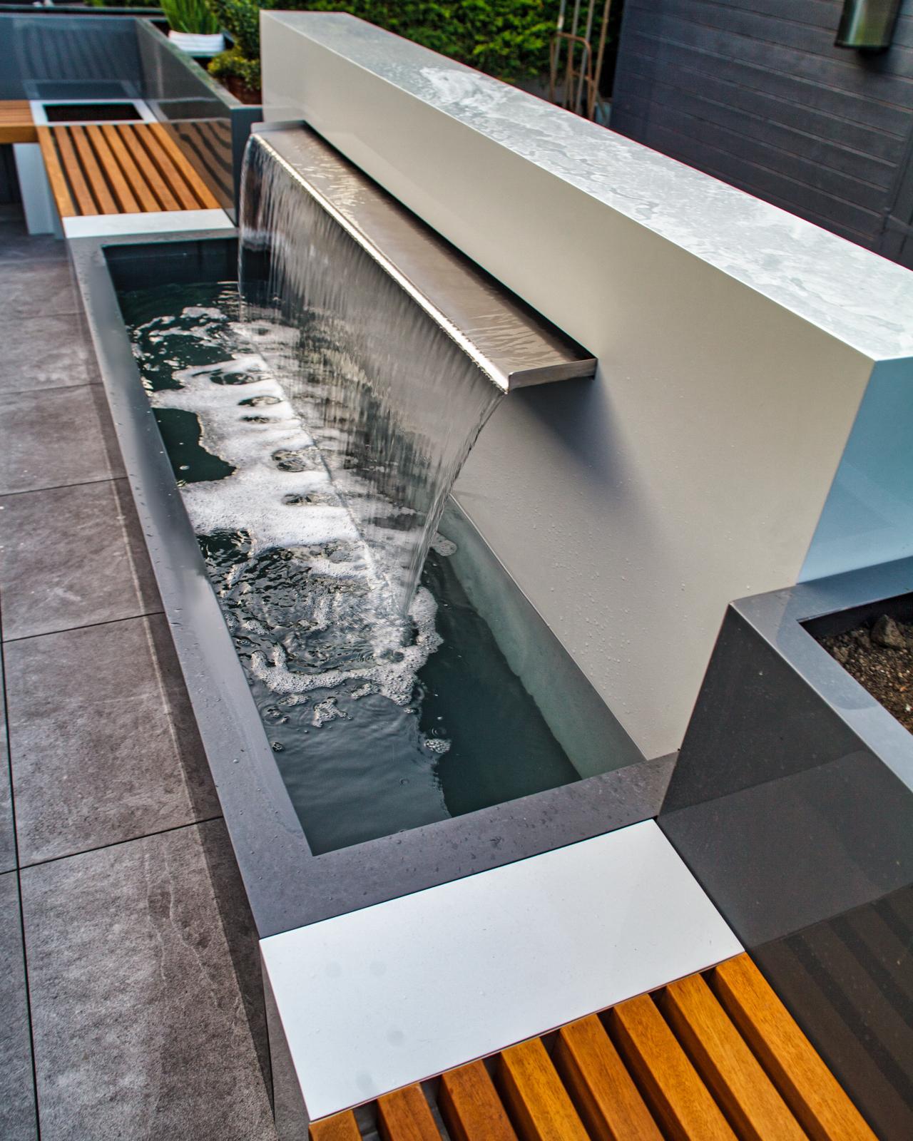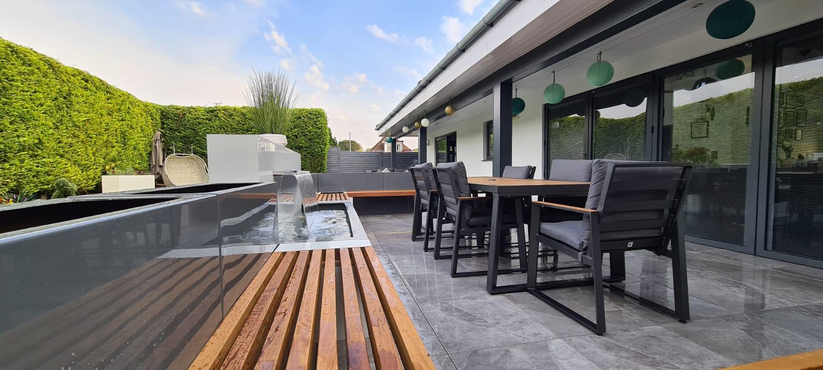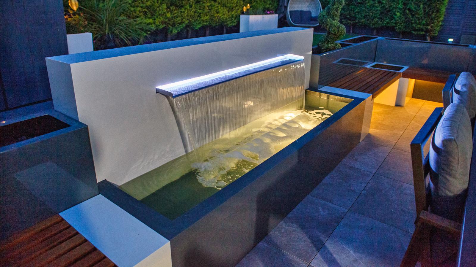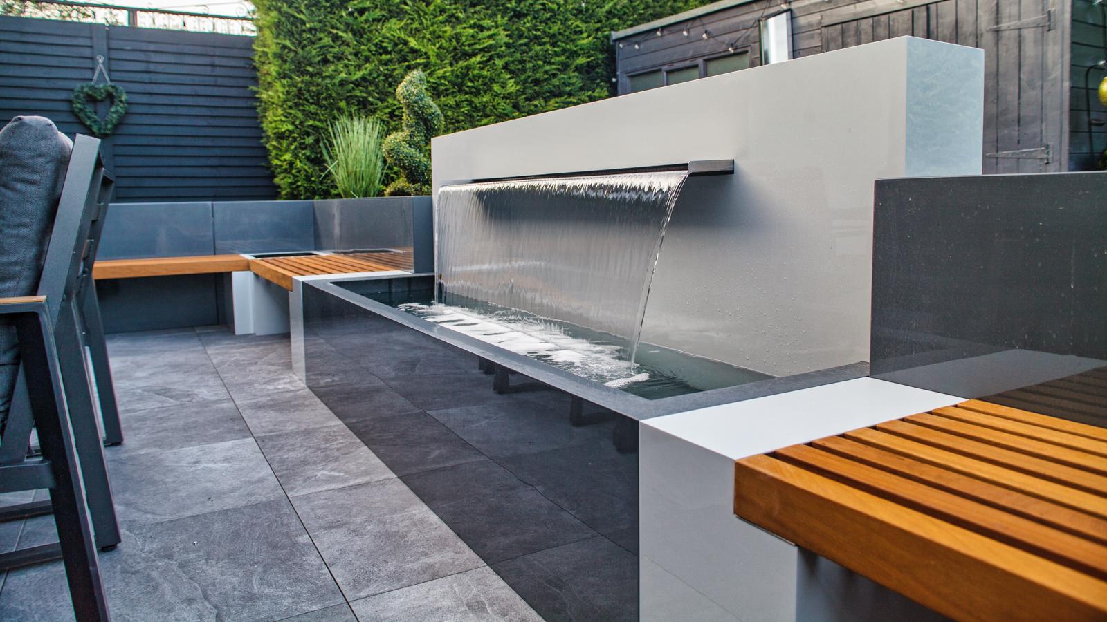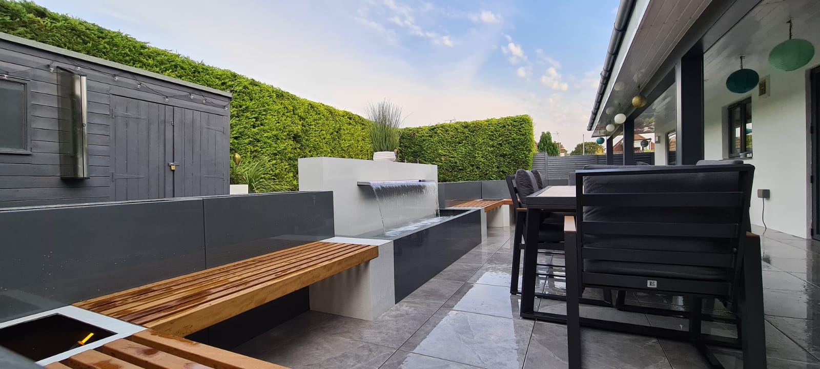 Porcelain Paving, Composite Decking, Planters, Fire Pit and Water Features.